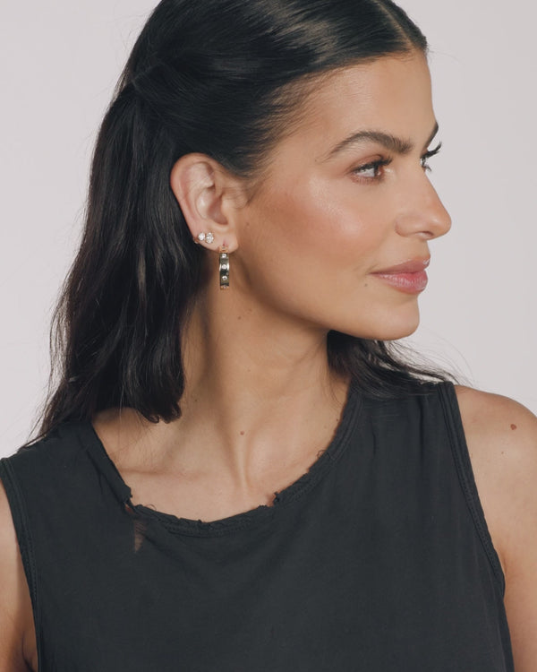 A refined hoop in the perfect everyday size, defined by smooth, polished curves and bezel-set round simulated diamonds that strike the perfect balance of polish and ease.